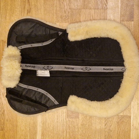 Produktinformasjon: "Anatomisk utformet korreksjonspad i saueskinn. Følger hestens ryggkontur og gir samtidig ryggraden frihet. Leveres med seks par innlegg i filt, tre foran og tre bak, slik at du kan forhøye salen foran eller bak etter behov."