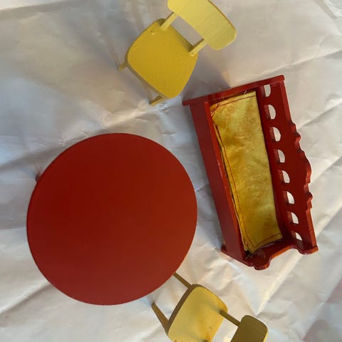 Hagemøbler med to stoler og et bord. Den ene stolen har en flekk. Parasollen som følger med har en metallstang og har vært limt. Er usikker på om den er original Lundby. Kan sendes sammen med andre småting.