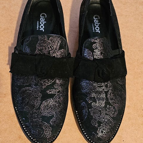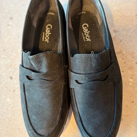 Gabor loafers i størrelse 40, svart farge. Selges da de er litt for store. Skoene har en solid såle med mønster og dekorativ detalj på oversiden. Passer for daglig bruk.