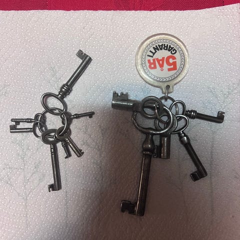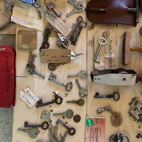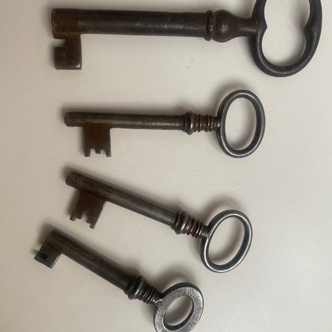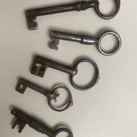 Sett med ulike gamle nøkler i forskjellige størrelser og former.