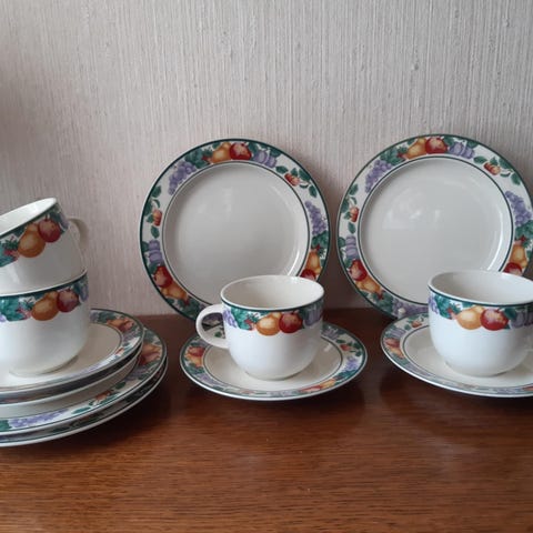 Håndlaget keramisk kaffekopp med tilhørende skål i blå farger. Produktet består av to sett med kopp og skål med unike dekorative mønstre i blått, rosa og hvitt. Passer til servering av kaffe eller te.