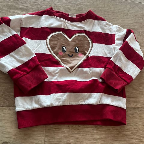 Lindex unisex genser i størrelse 116. Genseren er laget av bomull og har en rød farge. Den har et dekorativt reinsdyrmotiv på forsiden med detaljer i flere farger.
