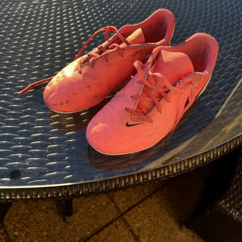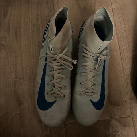Nike Phantom fotballsko i blå og beige farger. Skoene har en strikket overdel. Størrelse 38,5