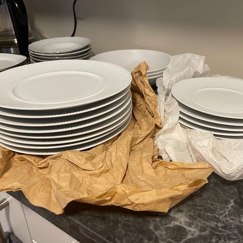3 stk gule tallerkener som er 23 cm bred og 2 stk blå tallerken som 20 cm bred. Selges for 40,-