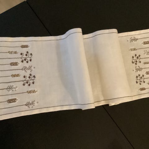 Lekker stor løper som er pent brukt, 135x34cm + gullduskene. 55% bomull/45% polyester. Selges kr 80,- + ev porto fra Hgsd