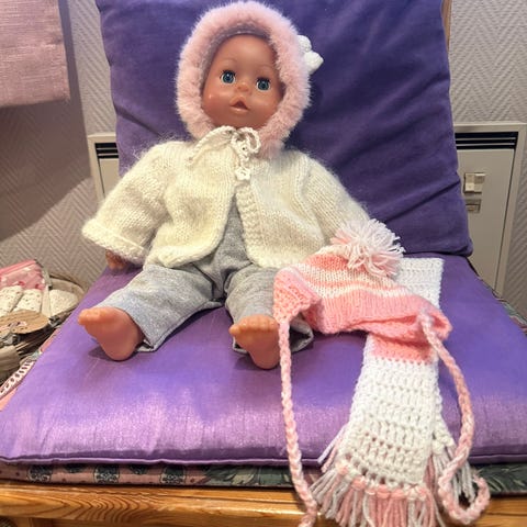 Genser, bukse og lue strikket, samt en cape og lue og en bukse i fleece stoff