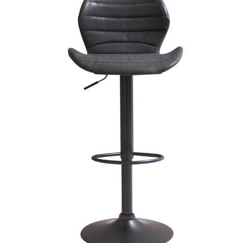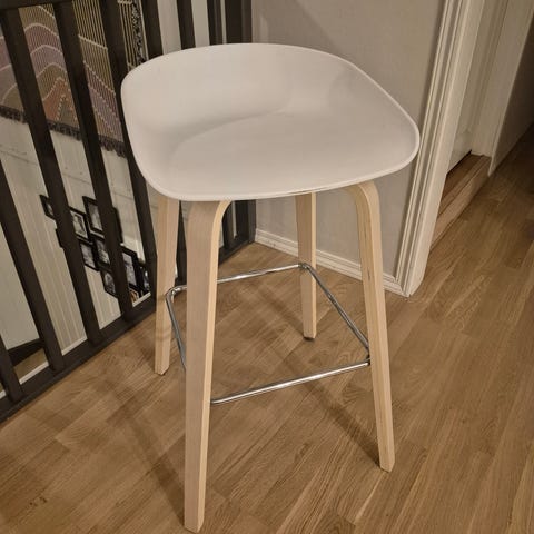 Barstol med grått stofftrekk og ben i tre. Setehøyde målt til omtrent 65 cm. Stolens bredde og dybde målt til cirka 60 cm. Passer for bruk ved kjøkkenøy eller barbord.