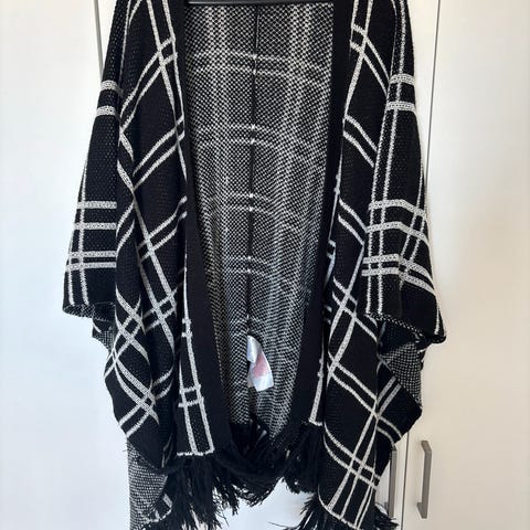 Svart poncho. Aldri brukt. Selges da den får for lite bruk. Fint strikket strukturmønster.