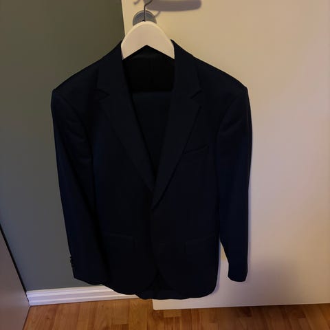 Tiger of Sweden dressjakke og bukser i blå. Laget i 43% ull og resterende er polyester. Dressen er i størrelse 44.(dressen er sydd opp noe på beina) Dressjakken har klassisk snitt med to lommer foran og enkeltspent knappelukking. Buksene er tilpasset samme farge og materiale, og har en formell passform. Merk at buksene har noen små merker.