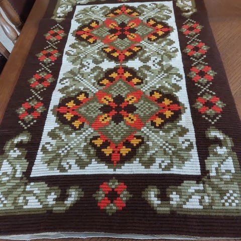 Åkle/ veggteppe brodert i ull. Pent håndarbeid. Varme farger.