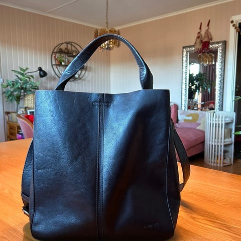 Kjøpt i høst og brukt fåtall ganger så fortjene en ny eier. Noen veldig få «merker» blir det jo i semsket skinn som ikke er til å unngå, men slik er semsket stoff. Noe vask over med klut og impregner så er den nok så god som ny. Har til og med ikke fått tatt av beskyttelse på trykk knapp så lite brukt er den. Vesken selges som den er :)