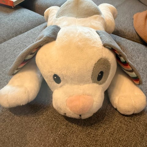 Zazu kosedyr formet som en hund, samt detaljer i stripete stoff. Laget av mykt materiale, egnet for barn.