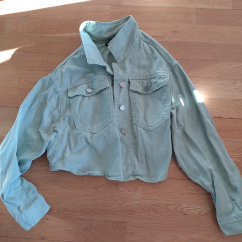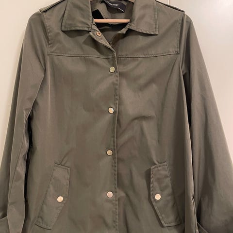 Zara Annet yttertøy i størrelse S for kvinner. Jakken er grønn og laget av bomull. Den har dekorative fjærdetaljer nederst og flere lommer foran. Jakken har broderi på ryggen og knappelukking foran.