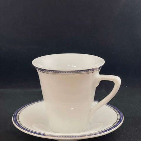 Porsgrund OL-Lillehammer Kopp med hank og tilhørende dyp tallerken med blå kant og dekorative detaljer. Materiale: porselen.
