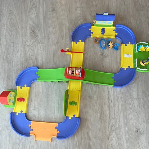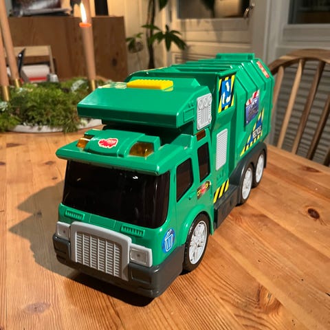 Perfekt for barnet som elsker kjøretøy. Manuell betjent søppelluke bak. Én av hjulkassene som er festet i kjøretøyet er knekt. Til tross for skaden, er lydfunksjonene forsatt fungerer som den skal🚛