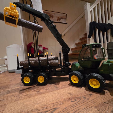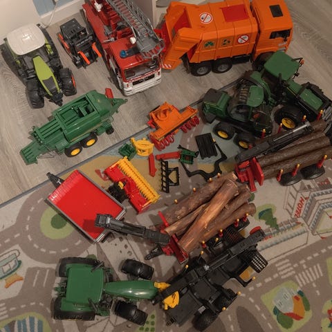 John Deere traktor med tilhørende landbruksredskap i grønn og gul farge. Modellen viser detaljerte dekk og landbruksutstyr festet bak traktoren. En av hjulen lit går på feil siden,men fungerer forsatt.