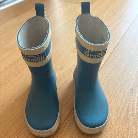 Skoene er i god stand. Svarte sko er størrelse 24, regnstøvlene er størrelse 23. Prisen per par er 50 kroner.
