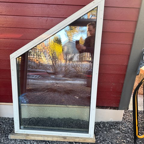1 x 1,5 meter, avrundede hjørner i front. Fasettslipt kant, 6 mm tykkelse