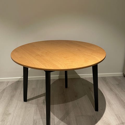 Spisebord JEGIND Ø105 eik/svart og 4 stykk KASTRUP kjøkkenstoler i svart. Må hentes på Løren.