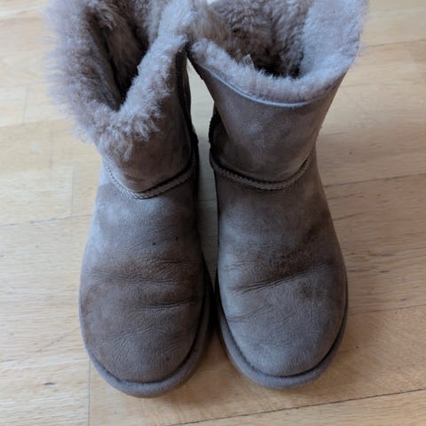 UGG Classic Mini støvler for jente i størrelse 36. Støvlene er svarte og laget i semsket skinn med myk fôr innvendig. Designet for å gi varme og komfort ved kaldt vær.