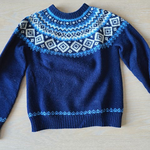 Genser i ull for dame i størrelse S med brun farge. Genseren har lange ermer og et mønster med silhuetter av mennesker i svart på brun bakgrunn.