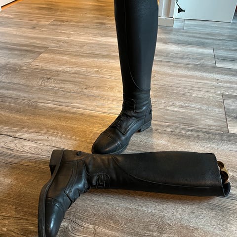 Ridestøvler i lær. Lærkledd innside. Innersåle med ekstra komfort. Strikk langs glidelåsen for bedre passform. Elastisk snøring foran. Anti slip gummisåle for bedre feste på glatte underlag. Lyse dekorsømmer.