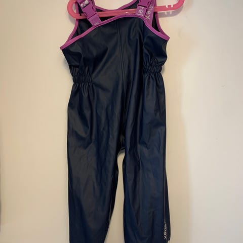 Selger en regnbukse i str 98 fra Reflex. Perfekt til barnehagen. Trenger en vask og mangler en strop på den ene foten (se bilde), ellers perfekt til barnehagebruk :))