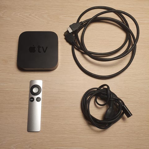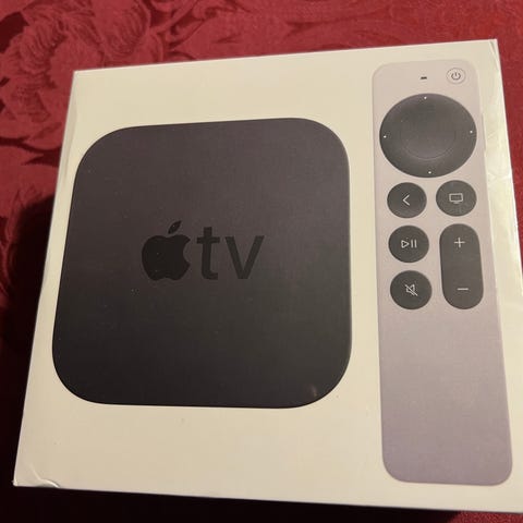 Apple TV 4. generasjon digital mediespiller. Modellnummer A1625, lansert i 2015. Tilgjengelig med lagringskapasitet på 32 GB eller 64 GB. Usikker hva str det er på denne. Inkluderer fjernkontroll og HDMI-kabel for tilkobling.