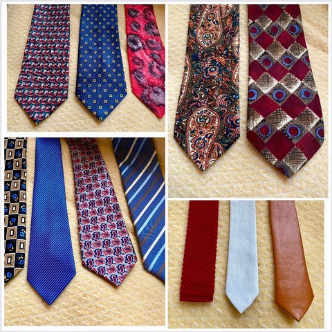 Klassiske og retro slips i silke (og ett i polyester), hovedsakelig fra 1980- og 1990-tallet, samt ett ekte vintage-slips fra 1970-tallet.