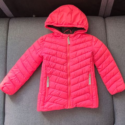 Myk og varm vattert vinterjakke med avtakbar hette. Lommer uten glidelås. Rosa utenpå, svart inni. Str 110.