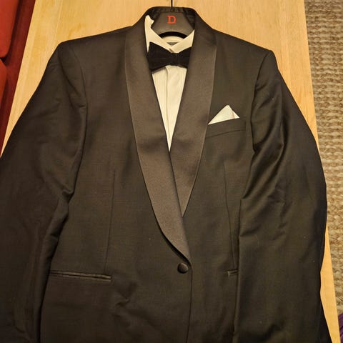 Har også brokadevest og kravat i sølvfarge. Brukt to ganger. Kan medfølge hvite bukseseler. Nyvasket men trengs å strykes.