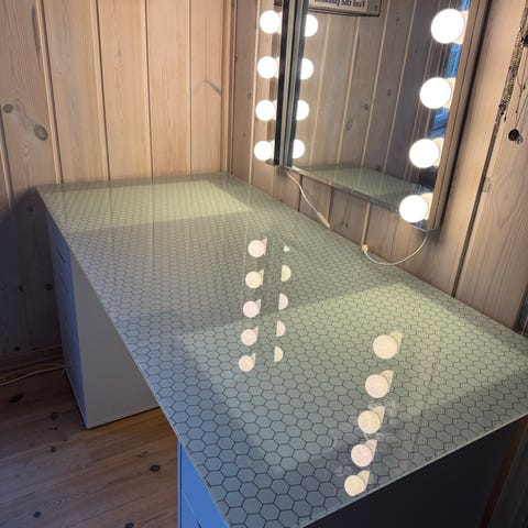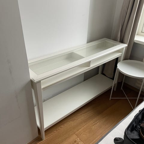 IKEA konsollbord med glassplate og hvit metallramme. Bordet har et enkelt og moderne design med en gjennomsiktig glassoverflate og en hvit underhylle for ekstra oppbevaring. Passer til bruk i stue, gang eller kontor.