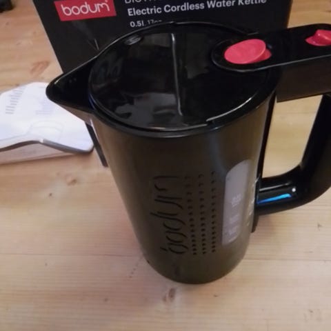 Bodum Vannkoker med en kapasitet på 1,0 liter. Laget av svart plast med vannivåindikator