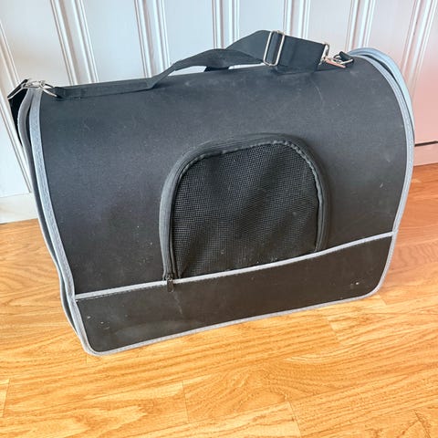 Sort bæreveske med nettingpaneler og flere lommer med glidelås. Vesken har justerbar skulderrem og forsterkede kanter i brunt materiale. Egnet for transport av små kjæledyr eller gjenstander som krever ventilasjon. Perfekt til å frakte hjem valpen enten i bil eller på fly. Kan åpnes med glidelås både foran og på toppen. Vesken er som ny, kun brukt et par gangen når valpen var liten. Passer til hund under 5 kg. Nypris 450kr