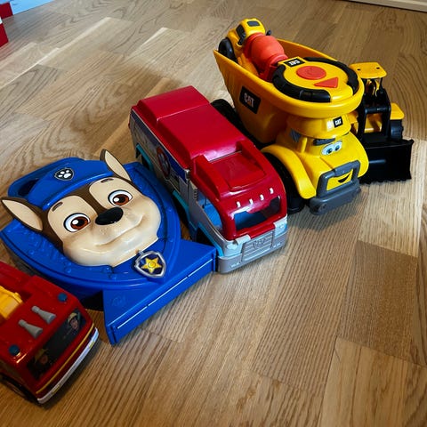 Paw Patrol lekebiler med karakterfigurer og to basketballleker i oransje og blått. Passer for barn som liker lek med kjente barne-tv-karakterer og sportsleker.