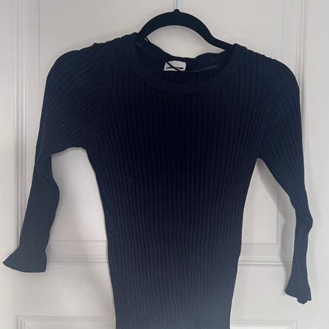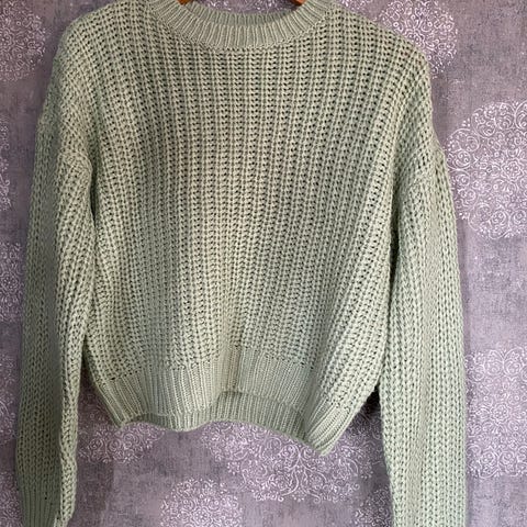 Tykk og myk strikkegenser i frisk grønn farge med grov struktur. Kortere modell med rund hals og lange ermer – perfekt til høst og vinter.