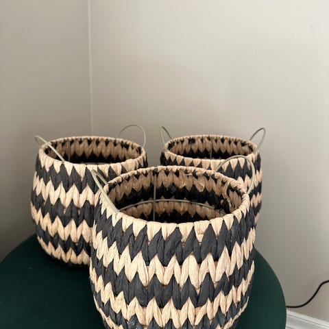 Sett med to røde metall blomsterpotter med dekorative utskjæringer. Høyde 22 cm. Øvre diameter er 14,5 cm og bunn 11 cm. Selges for kr 150.