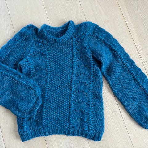 Hjemmetstrikket florlett pengenser strikket i brushed alpakka, farge bordeaux. Brede veangborder, 13 cm. Brukt en gang.