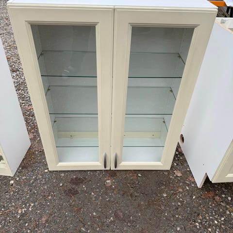 Skap, antikk hvit, med to dører. Nordisk design, shaker stil. Ramme rund skapet. Skapet er av tykk MDF og dørene er av heltre. To hyller inni. Uttak i bakkant fra elektrisk uttak. Tungt og solid. Laget av møbelsnekker. Kan brukes som underskap eller overskap på kjøkken for eksempel.