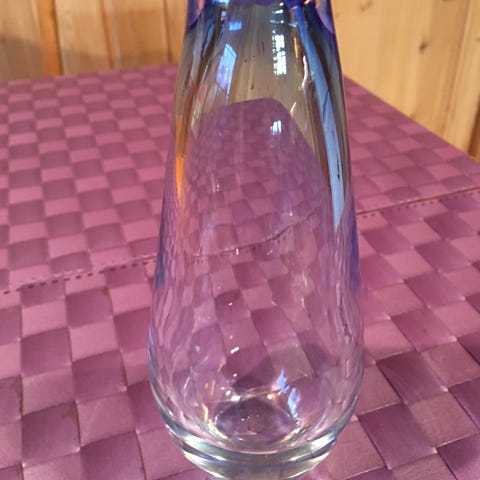 Blå vase i krystallglass med luftblærer fra Magnor Glassverk fra ca. 1970. Høyde ca 15.5 cm, ø ca 8 cm.