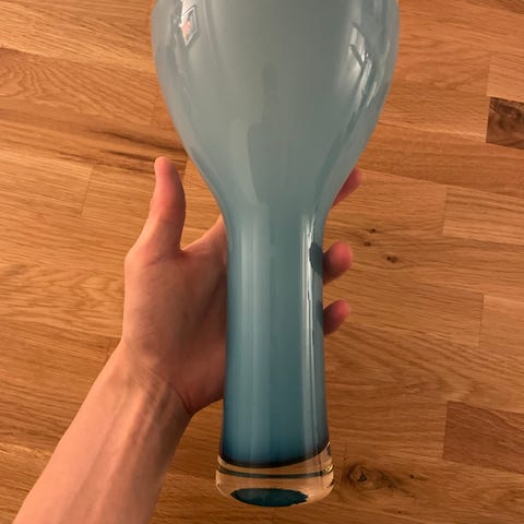 Nydelig liten grønn tonet bollevase. Den er 12 cm høy, dybde 10 cm og bredde 11 cm.