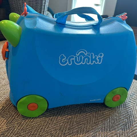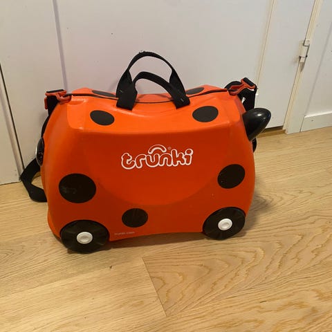 Barnekoffert som er perfekt å ha når en reiser med barn. De kan sitte på kofferten og bli dratt.