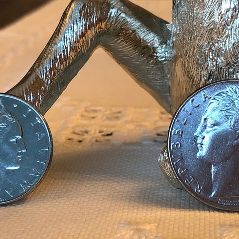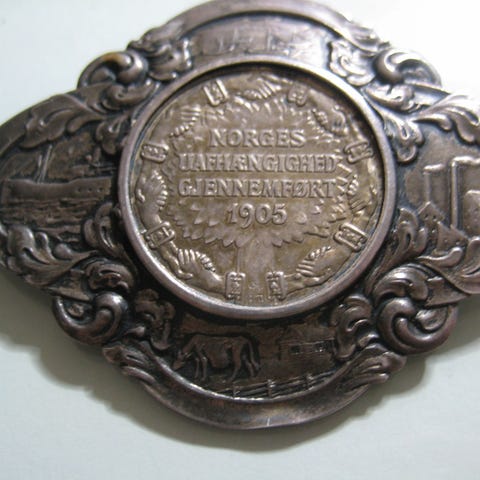 Norsk 10 Kroner mynt fra 1964 med motiv av Eidsvollbygningen på den ene siden og Norges riksvåpen på den andre siden. Gravert , på side, Tro til Dovre faller.