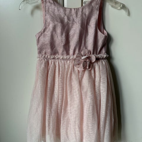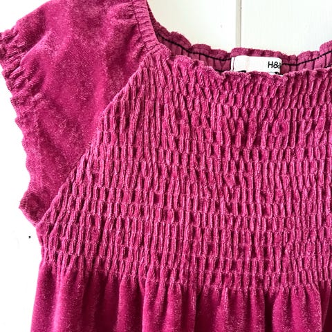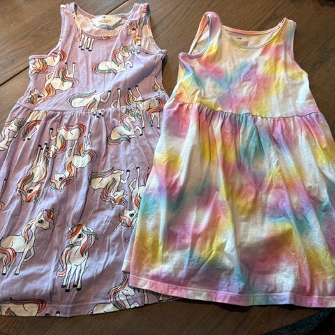 2 kjoler fra H&M i størrelse 116. En kjole er mørke rød og en er i en rosa tone. Kjolene har blomsterdetaljer og er designet for barn. Kjolene er laget av polyester.