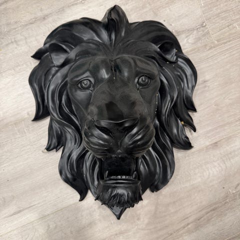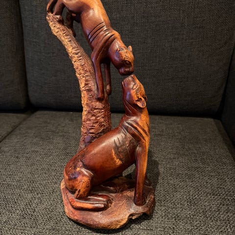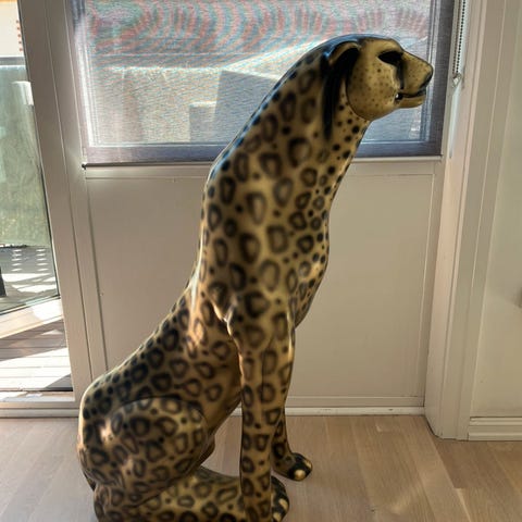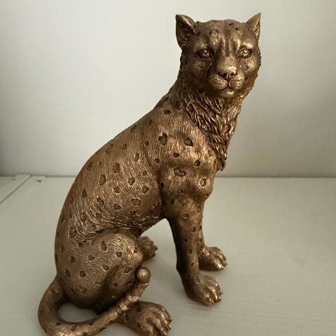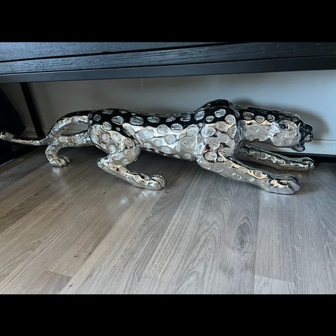 Dekorativ metallfigur formet som en leopard. Figuren har en sølvfarget, polert overflate med en strukturert design som gir et unikt utseende. Passer til bruk som dekorasjon i hjem eller kontor.