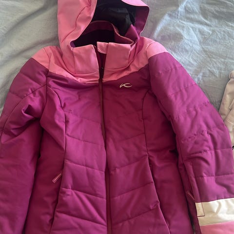Mørkeblå skidress fra Kjus med oransje og lyseblå detaljer. God og varm bukse og jakke. Foret og tåler kaldt vær. Jakken har snølås og plass til heiskort i jakkelommen.