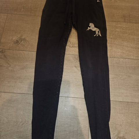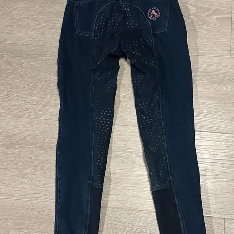 Horze ridebukser for barn i størrelse 160 cm. Buksene er mørkeblå med forsterkede områder i setet.