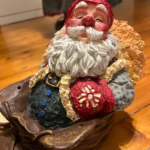 Den godslige nissen bærer preg av alderen, men er fortsatt fin og koselig. Den har ingen større skader eller avslag, men noen slitasjepunkter i glasuren. Se bildene. Selges derfor rimelig.