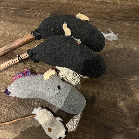 Har galopp og vrinske lyd. Kan slås av og på. Batteriboksen med on of knapp er på undersiden av hodet.