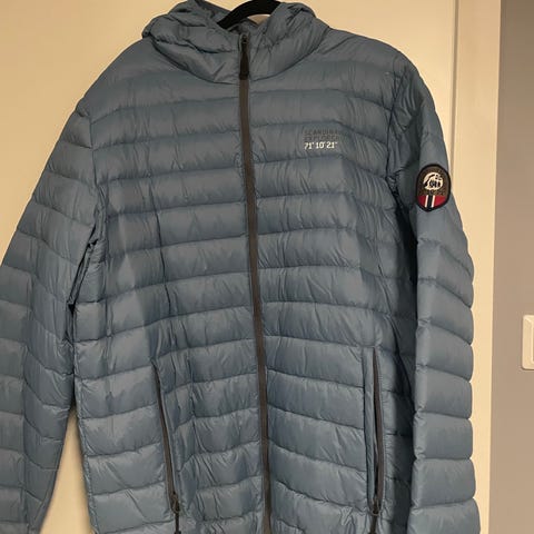 Ny boblejakke til herre, mørk grønn og blå med hette. Brukt en gang. Str. L, men smal over ryggen. Jakken har et lett polstret design med glidelås i front. Liten rift i rygg reparert (se siste bilde).